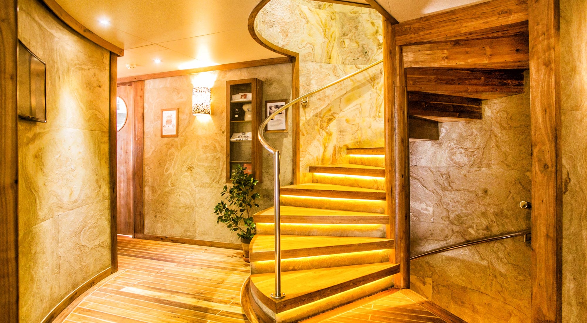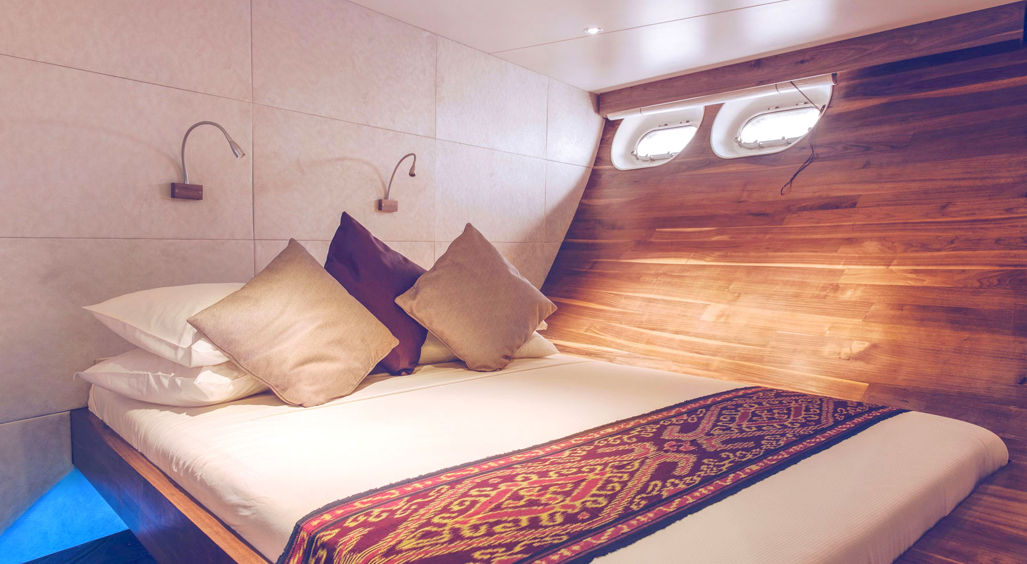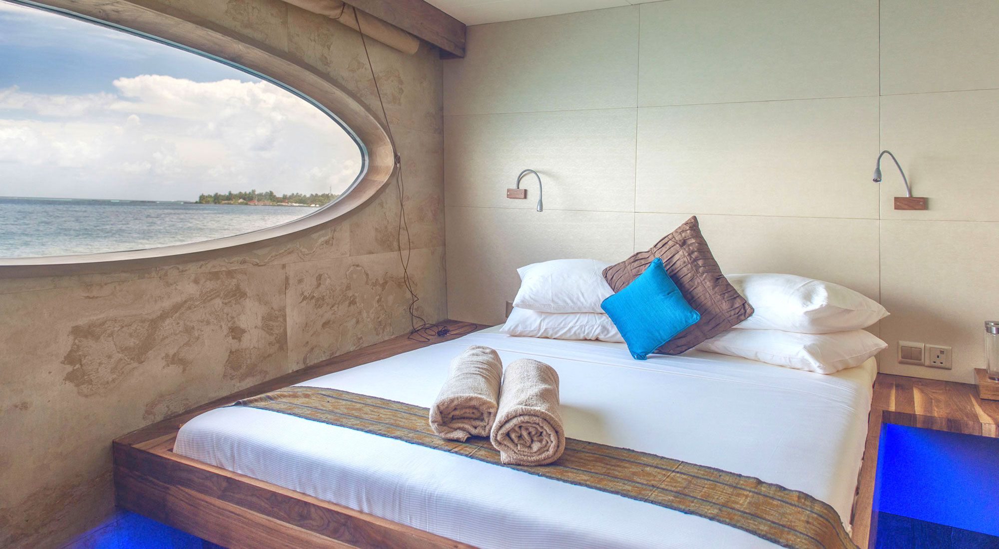 Три потрясающих люкса с кроватями размера "queen-size" и земным декором. Красиво оформленные люксы Dolphin расположены на главной палубе. В них есть кровати размера "queen-size" и просторные зоны отдыха. Яркие синие ткани дополняют цветовую гамму, вдохновленную природой, а овальные панорамные окна, встроенные в корпус, открывают захватывающий вид на океан.