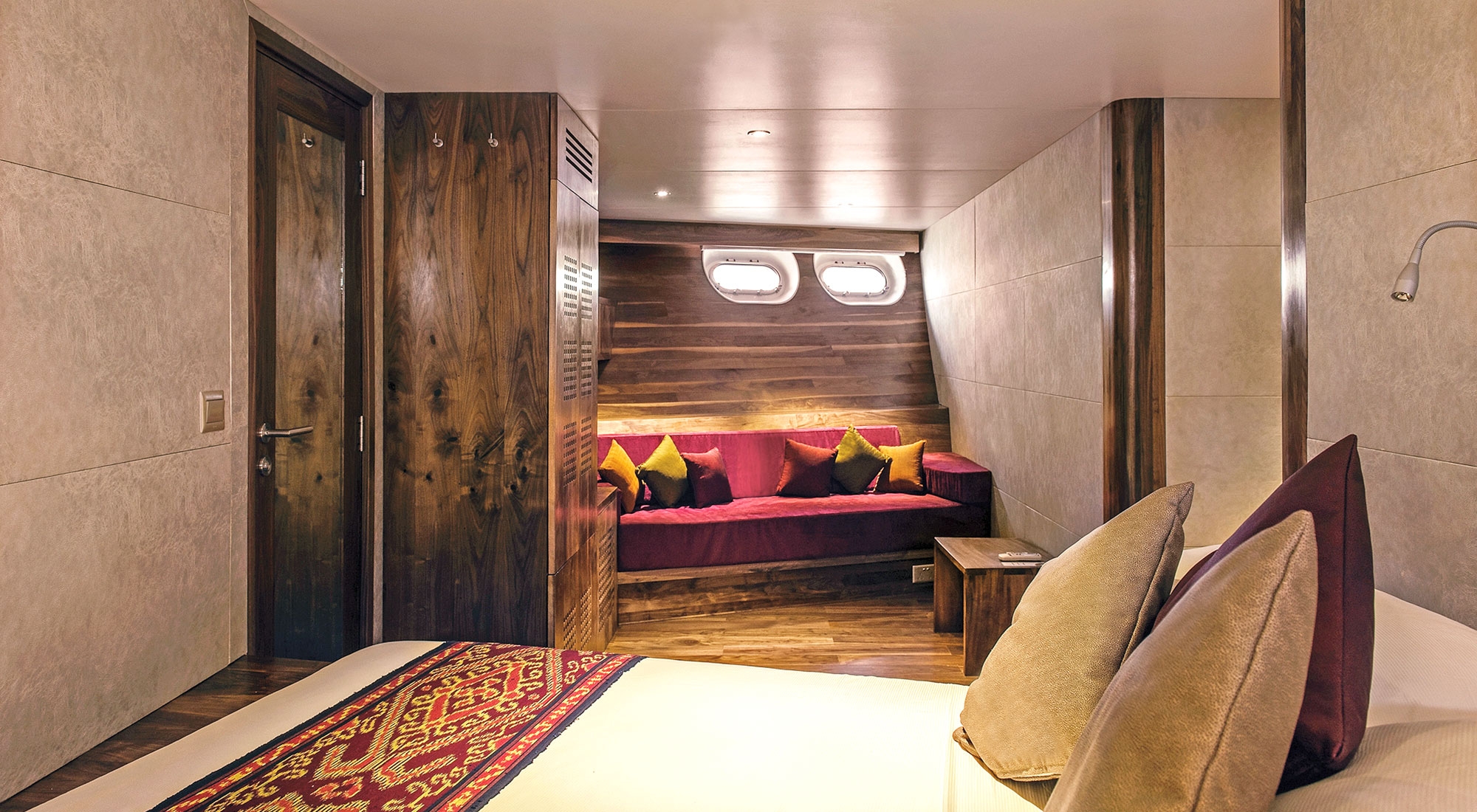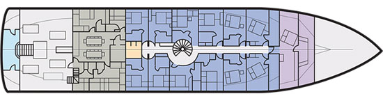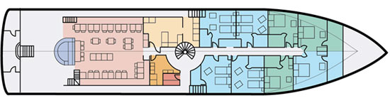Суперлюкс с кроватью размера "queen-size" и диваном-кроватью. Cowrie Suite уютно расположился в носовой части нижней палубы. Кровать размера «queen-size» и роскошный рубиновый диван, который можно превратить в удобную третью кровать. Поскольку Cowrie Suite занимает всю ширину носовой части, в нем есть четыре открывающихся иллюминатора, а в просторной ванной комнате находится самый большой душ на борту.