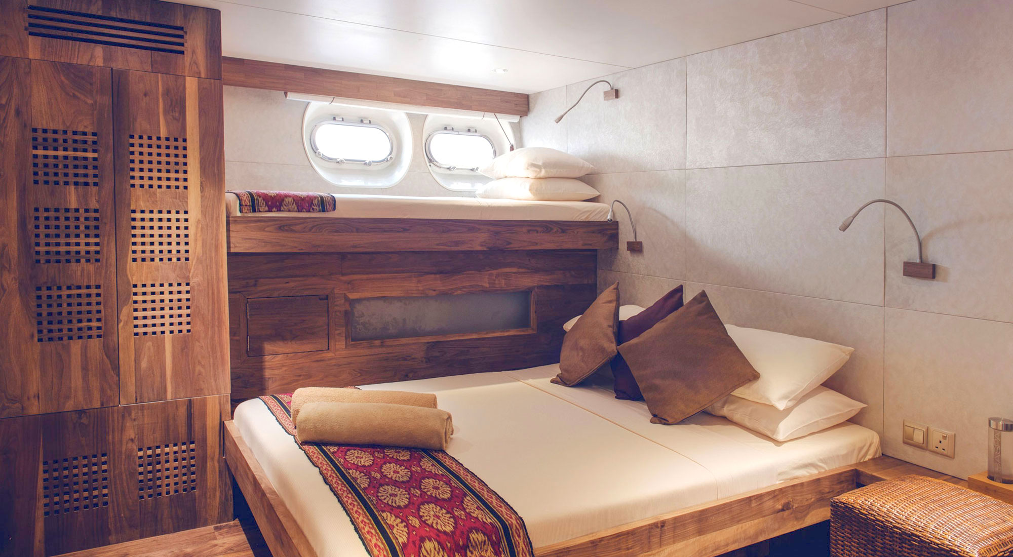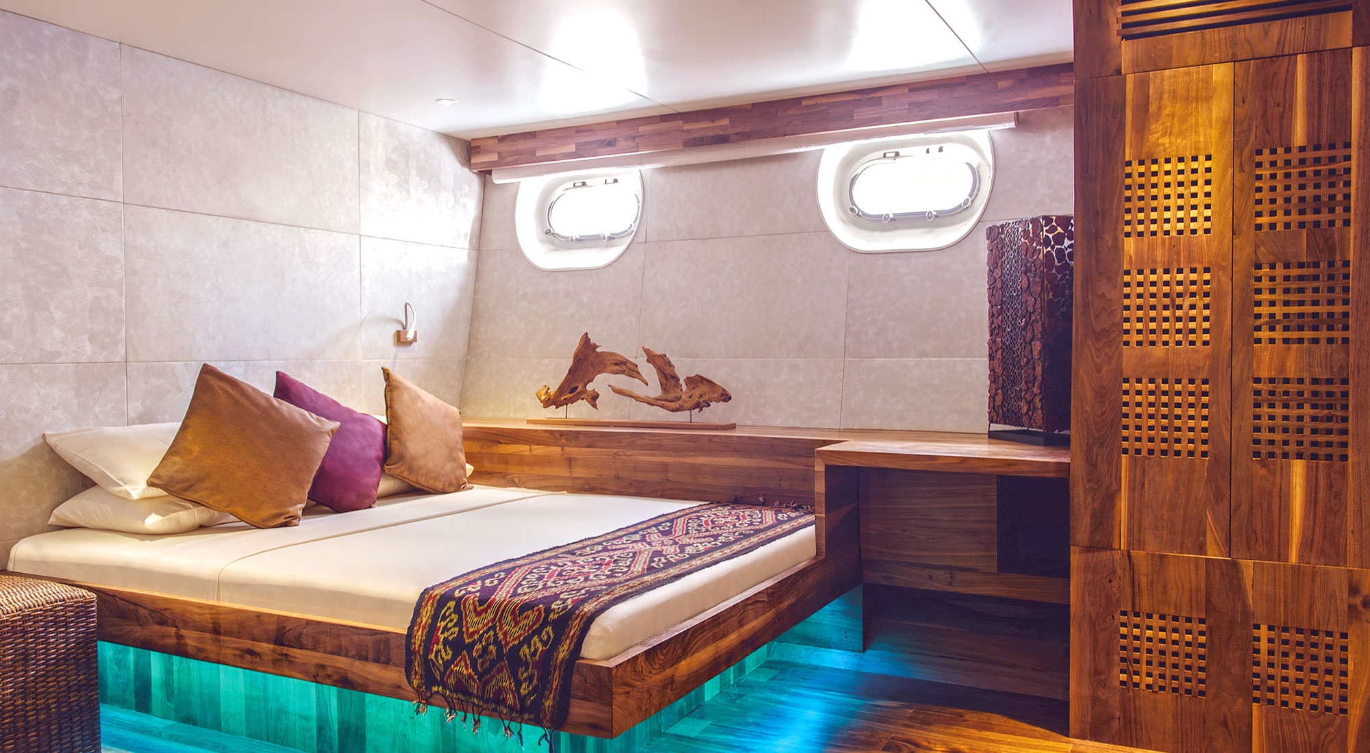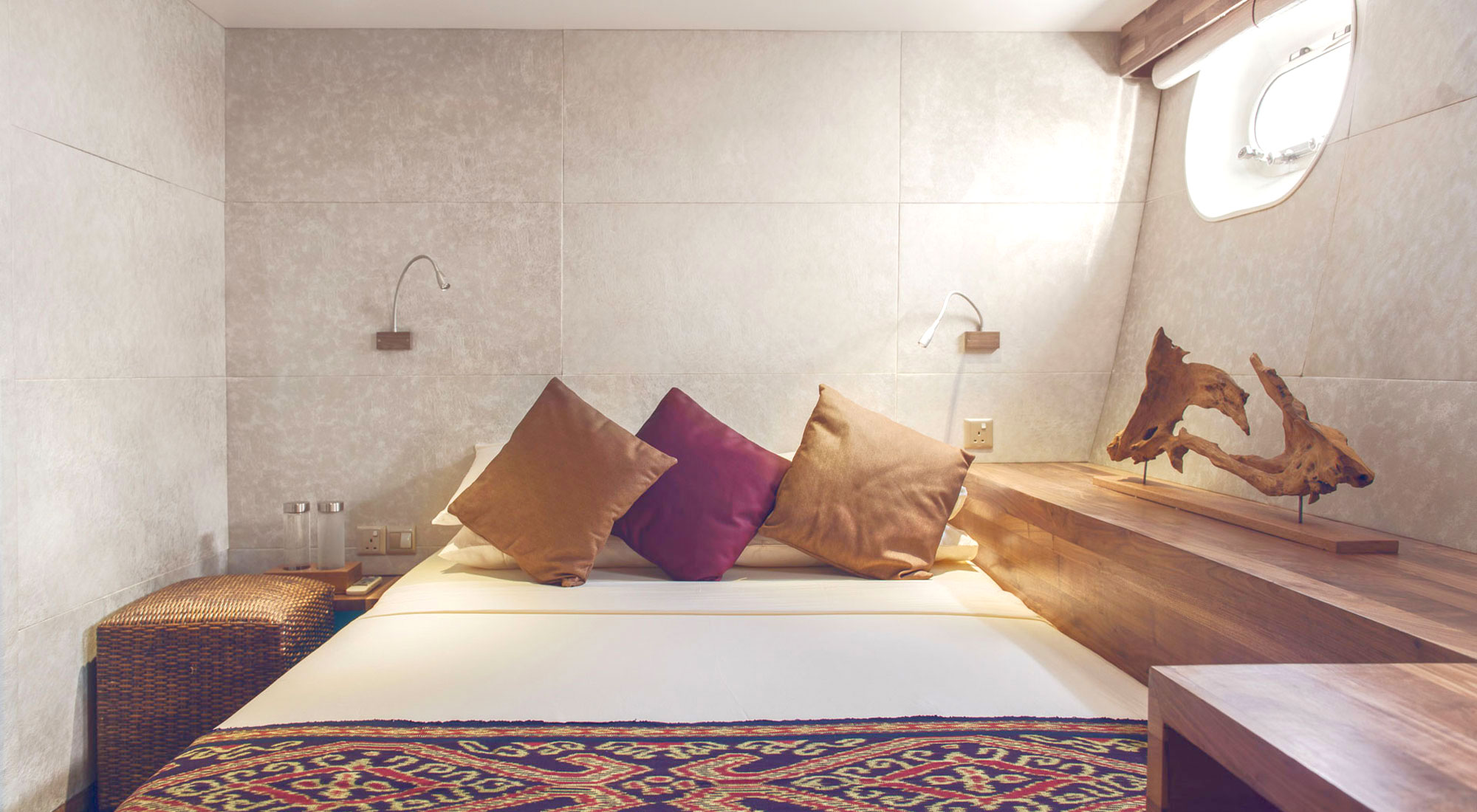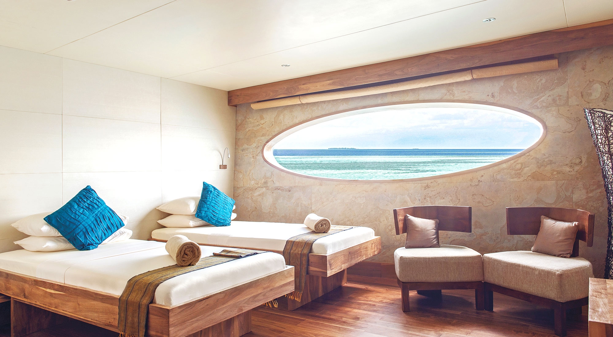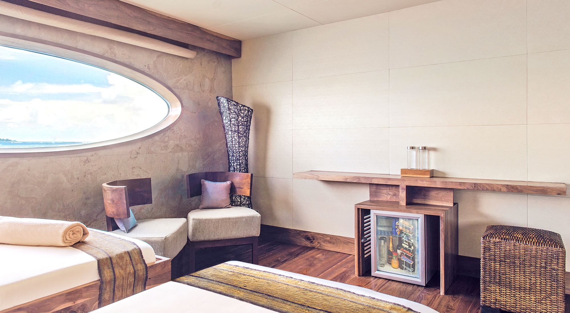 Каюты Manta Suite, расположенные на главной палубе, представляют собой каюты премиум-класса Scubaspa, в которых удобные кровати размера «king-size» сочетаются со стильными зонами отдыха. В лаконичном дизайне использованы естественные тона и материалы, а большие овальные панорамные окна, встроенные в корпус, открывают панорамный вид на океан.