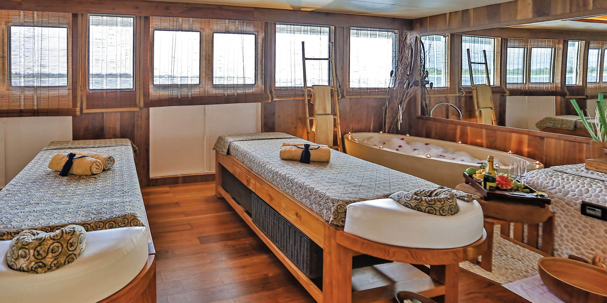 Наш спа-центр в азиатском стиле площадью 300 квадратных метров является крупнейшим в своем роде на Мальдивах и идеальным местом для расслабления и расслабления. Занимая две палубы, его помещения состоят из четырех процедурных кабинетов (в том числе одного для процедур для пар), уединенной палубы для тайского массажа или медитации на открытом воздухе и затененного спа-лаунджа для занятий йогой и релаксации. Наша высококвалифицированная команда спа-салонов доступна в течение дня и вечера, чтобы предложить полный спектр расслабляющих массажей и косметических процедур.
